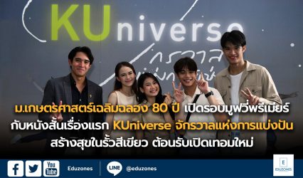 ข่าวเด่น ม.เกษตรศาสตร์เฉลิมฉลอง 80 ปี เปิดรอบมูฟวี่พรีเมียร์กับหนังสั้นเรื่องแรก “KUniverse จักรวาลแห่งการแบ่งปัน” สร้างสุขในรั้วสีเขียว ต้อนรับเปิดเทอมใหม่ EZ Webmaster June 8, 2023 วันที่ 7 มิถุนายน 2566 มหาวิทยาลัยเกษตรศาสตร์เปิดตัวภาพยนตร์สั้น “KUniverse” โชว์ตัวตนความเป็นมหาวิทยาลัยเกษตรศาสตร์ เนื่องในโอกาสฉลองครบรอบ 80 ปี พร้อมดึงนิสิตปัจจุบันและนิสิตเก่าชื่อดัง อาทิ แพนเค้ก เขมนิจ, นุนิว ชวรินทร์…