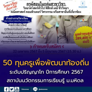50 ทุนครูเพื่อพัฒนาท้องถิ่นระดับปริญญาโท ปีการศึกษา 2567 สถาบันนวัตกรรมการเรียนรู้ ม.มหิดล EZ Webmaster June 4, 2024 ทุนครูเพื่อพัฒนาท้องถิ่นระดับปริญญาโท ปีการศึกษา 2567 จำนวน 50 ทุน! (ทุนในประเทศ) หลักสูตรวิทยาศาสตรมหาบัณฑิต สาขาวิชาวิทยาศาสตร์และเทคโนโลยีศึกษา (หลักสูตรนานาชาติ) สถาบันนวัตกรรมการเรียนรู้ เข้าร่วมเป็นหนึ่งในสถาบันผลิตของโครงการผลิตครูเพื่อพัฒนาท้องถิ่น ระดับปริญญาโททางการสอน รุ่นบรรจุปี พ.ศ.2563 จำนวน 50 ทุน มูลค่าทุนตามที่จ่ายจริงไม่เกิน 289,400 บาท/ปี/คน รับสมัครตั้งแต่บัดนี้ ถึง 5 มิถุนายน 2567 (เวลา 15.30 น.)สมัครออนไลน์ผ่านทาง https://link.buu.ac.th/kru2563เอกสารประกอบการสมัคร https://bit.ly/3JvClDZรายละเอียดหลักสูตร https://bit.ly/3WfMts3 หลักสูตรวิทยาศาสตรมหาบัณฑิต สาขาวิชาวิทยาศาสตร์และเทคโนโลยีศึกษา เป็นหลักสูตรนานาชาติ จัดการเรียนการสอนเป็นภาษาอังกฤษ สอนโดยคณาจารย์ที่มีความเชี่ยวชาญในสาขา วิทยาศาสตร์และเทคโนโลยีศึกษา สาขาคณิตศาสตร์ศึกษา และสาขาอื่น ๆ ที่เกี่ยวข้อง ผู้เรียนได้เสริมสร้างองค์ความรู้ ทักษะ กระบวนการคิด เพื่อเป็นผู้นำด้านการศึกษา สร้างสรรค์นวัตกรรมเพื่อการเรียนรู้สู่สังคมและความเป็นเลิศในระดับสากล สอบถามเพิ่มเติมติดต่อ… Continue Reading
