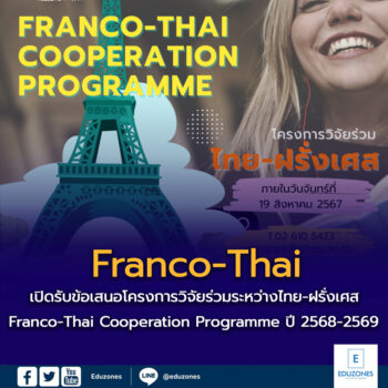 EZ Webmaster May 30, 2024 เปิดรับข้อเสนอโครงการวิจัยร่วมระหว่างไทย-ฝรั่งเศส Franco-Thai Cooperation Programme ปี 2568-2569 EZ Webmaster May 30, 2024 กระทรวงการอุดมศึกษา วิทยาศาสตร์ วิจัยและนวัตกรรม (อว.) ร่วมกับรัฐบาลฝรั่งเศส เปิดรับข้อเสนอโครงการวิจัยร่วมภายใต้ความร่วมมือด้านอุดมศึกษาและการวิจัยระหว่างไทย-ฝรั่งเศส (Franco-Thai Cooperation Programme in Higher Education and Research/Franco-Thai Mobility Programme/ PHC SIAM) ประจำปี พ.ศ. 2568-2569 โดยผู้สนใจสามารถจัดทำข้อเสนอโครงการและเอกสารประกอบการสมัครจำนวน 8 ชุด (ต้นฉบับ 1 ชุด และสำเนา 7 ชุด) พร้อมหนังสือนำจากสถาบันอุดมศึกษาต้นสังกัดหรือสถาบัน/หน่วยงานวิจัยภายใต้ อว.… Continue Reading