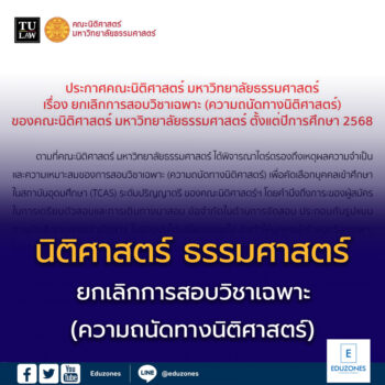 คณะนิติศาสตร์ มหาวิทยาลัยธรรมศาสตร์ ยกเลิกการสอบวิชาเฉพาะ (ความถนัดทางนิติศาสตร์) EZ Webmaster May 24, 2024 ประกาศคณะนิติศาสตร์ มหาวิทยาลัยธรรมศาสตร์เรื่อง ยกเลิกการสอบวิชาเฉพาะ (ความถนัดทางนิติศาสตร์)ของคณะนิติศาสตร์ มหาวิทยาลัยธรรมศาสตร์ ตั้งแต่ปีการศึกษา 2568.ตามที่คณะนิติศาสตร์ มหาวิทยาลัยธรรมศาสตร์ ได้พิจารณาไตร่ตรองถึงเหตุผลความจำเป็นและความเหมาะสมของการสอบวิชาเฉพาะ (ความถนัดทางนิติศาสตร์) เพื่อคัดเลือกบุคคลเข้าศึกษาในสถาบันอุดมศึกษา (TCAS) ระดับปริญญาตรี ของคณะนิติศาสตร์ฯ โดยคำนึงถึงภาระของผู้สมัครในการเตรียมตัวสอบและการเดินทางมาสอบ ข้อจำกัดในด้านการจัดสอบ ประกอบกับรูปแบบการคัดเลือกบุคคลเข้าศึกษาฯ ในปัจจุบันได้เปลี่ยนแปลงไป อันทำให้บุคคลผู้เข้าสอบวิชาเฉพาะไม่อาจได้รับการคัดเลือกเพื่อเข้าศึกษาในคณะนิติศาสตร์ฯ ได้ก่อนนั้น.คณะนิติศาสตร์ฯ จึงเห็นสมควรให้ยกเลิกการจัดสอบวิชาเฉพาะ (ความถนัดทางนิติศาสตร์) ทั้งที่ศูนย์รังสิตและศูนย์ลำปาง ตั้งแต่ปีการศึกษา 2568 เป็นต้นไป.ทั้งนี้ คณะนิติศาสตร์ฯ จะยังคงจำนวนรับบุคคลเข้าศึกษาระดับปริญญาตรีของคณะนิติศาสตร์ฯ ไว้เช่นเดิม ดังนี้ รอบที่ 2 Quota ประจำปีการศึกษา 2568 จำนวน 50 คน (สำหรับศูนย์ลำปาง) และรอบที่ 3 Admission… Continue Reading
