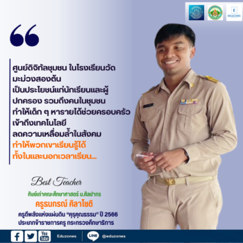 tui sakrapee April 16, 2024 “ธนกรณ์ ศิลาโชติ ” ทุ่มกายใจเพื่อศิษย์ ครูดีพลังแห่งแผ่นดิน ศิษย์เก่าศึกษาศาสตร์ ศิลปากร tui sakrapee April 16, 2024 นายธนกรณ์ ศิลาโชติ ศิษย์เก่าคณะศึกษาศาสตร์ วิชาเอกสังคมศึกษา มหาวิทยาลัยศิลปากร วิทยาเขตพระราชวังสนามจันทร์ จังหวัดนครปฐม สร้างชื่อเสียงให้แก่สถาบันการศึกษา และโรงเรียนวัดมะม่วงสองต้น อำเภอเมือง จังหวัดนครศรีธรรมราช หลังทุ่มเทและเสียสละ เอาใจใส่ในการสอนและพัฒนานักเรียนในโรงเรียนโรงเรียนวัดมะม่วงสองต้น จนได้รับคำชื่นชมจากทั้งในโรงเรียนและสังคมภายนอก หนึ่งในการพัฒนาโรงเรียนที่เห็นเป็นรูปธรรมล่าสุด คือการมีส่วนร่วมในการจัดตั้งศูนย์ดิจิทัลชุมชน กระทรวงดิจิทัลเพื่อเศรษฐกิจและสังคม ในโรงเรียนวัดมะม่วงสองต้น ซึ่งครูธนกรณ์ ได้กล่าวผ่านสื่อมวลชนที่มารายงานข่าวว่า ศูนย์ดิจิทัลชุมชนแห่งนี้ ถือเป็นประโยชน์อย่างยิ่งแก่นักเรียนและผู้ปกครอง รวมถึงคนในชุมชนที่ได้เข้ามาใช้ประโยชน์ในการพัฒนาตนเองและสืบค้นข้อมูลต่าง ๆ ที่สำคัญศูนย์แห่งนี้ จะทำให้เด็ก ๆ หารายได้ช่วยครอบครัว จากการเปิดร้านขายของออนไลน์ ทำให้พวกเขาได้เข้าถึงเทคโนโลยี สามารถเรียนรู้ได้ทั้งในและนอกเวลาเรียน อันเป็นการลดความเหลื่อมล้ำในสังคมได้เป็นอย่างดียิ่ง… Continue Reading