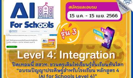 ครู-อาจารย์ ปิดเทอมนี้ สสวท. ชวนครูเติมไฟเรียนรู้ชั้นเรียนทันโลก “อบรมปัญญาประดิษฐ์สำหรับโรงเรียน หลักสูตร 4 (AI for Schools Level 4)” EZ Webmaster March 27, 2023 สถาบันส่งเสริมการสอนวิทยาศาสตร์และเทคโนโลยี (สสวท.) ชวนคุณครู นักเรียนและผู้สนใจเติมไฟเรียนรู้ช่วงปิดเทอมกับหลักสูตรอบรมออนไลน์ปัญญาประดิษฐ์สำหรับโรงเรียน หลักสูตร 4 (AI for Schools Level 4)เพื่อเพิ่มทักษะในการออกแบบและสร้าง AI Application อย่างง่าย สามารถปรับตัวและปรับเปลี่ยนตนเองเมื่อ AI เข้ามากระทบต่อตนเองและอาชีพ ตลอดจนเข้าใจประเด็นด้านจริยธรรมกับ AI ชั่วโมงเรียน 8 ชั่วโมง หลักสูตรผ่านการรับรองจาก ก.ค.ศ.แล้ว ชั้นเรียนจบ 19 เมษายน 2566 สมัครและเรียนฟรีที่ https://learn.teacherpd.ipst.ac.th/courses เนื้อหาประกอบด้วย 8 หน่วยการเรียนรู้ คือ แนะนำหลักสูตรปัญญาประดิษฐ์หลักสูตร 4 การออกแบบระบบปัญญาประดิษฐ์ ประกอบด้วยเนื้อหา…