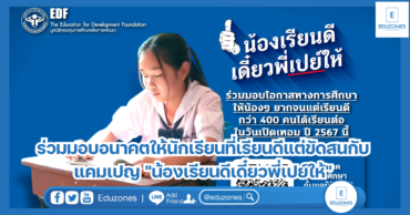 EZ Webmaster March 28, 2024 ร่วมมอบอนาคตให้นักเรียนที่เรียนดีแต่ขัดสนกับแคมเปญ “น้องเรียนดีเดี๋ยวพี่เปย์ให้” EZ Webmaster March 28, 2024 เพื่อส่งเสริมให้นักเรียนระดับชั้นมัธยมศึกษาตอนต้นที่เรียนดีที่มีเกรดเฉลี่ยสะสม 3.00 ขึ้นไป แต่ครอบครัวมีฐานะยากจนให้สามารถเรียนต่อจนจบช่วงชั้นเรียนเพื่อลดความเสี่ยงจากการหลุดออกจากระบบการศึกษากลางคัน และยังช่วยสร้างเสริมกำลังใจในการเรียนอย่างเต็มศักยภาพโดยไม่ต้องกังวลเกี่ยวกับฐานะความเป็นอยู่ของตนเอง มูลนิธิ EDF (มูลนิธิกองทุนการศึกษาเพื่อการพัฒนา) เชิญผู้ใหญ่ใจดีร่วมส่งเสริมการศึกษามอบทุนให้นักเรียนชั้นมัธยมศึกษาตอนต้นที่เรียนดีแต่ยากจนสำหรับปีการศึกษา 2567 ทุนละ 3,000 บาทต่อคนต่อปี ได้ภายใน 30 มิถุนายน 2567 แม้ครอบครัวจะมีฐานะยากจน เติบโตในท้องไร่ ท้องนา ไม่ได้มีชีวิตสุขสบายเหมือนเด็กคนอื่นอีกมากมาย แต่เด็กหญิงรุ่งวิภา วงศาสตร์ ที่กำลังศึกษาชั้นมัธยมศึกษาปีที่ 1 โรงเรียนปทุมราชวงศา จังหวัดอำนาจเจริญ กลับไม่ได้คิดว่าเป็นอุปสรรคต่อการเรียนหรือทำให้เกิดความท้อแท้ต่อชีวิตแต่ประการใด หากกลับเอาความลำบากยากแค้นของตนเองและครอบครัวเป็นแรงกระตุ้นผลักดันเป็นพลังบวกให้ตั้งใจเรียนมากยิ่งขึ้นจนมีผลการเรียนระดับดีมากเฉลี่ย 4.00 เด็กหญิงรุ่งวิภา… Continue Reading
