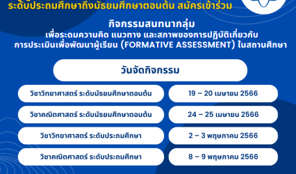 ครู-อาจารย์ สสวท. ชวนครูวิทย์ – คณิตระดมความคิดออนไลน์ แนวทางและการปฏิบัติเกี่ยวกับการประเมินเพื่อพัฒนาผู้เรียนในสถานศึกษา EZ Webmaster March 24, 2023 สถาบันส่งเสริมการสอนวิทยาศาสตร์และเทคโนโลยี (สสวท.) ขอเชิญครูผู้สอนวิทยาศาสตร์หรือคณิตศาสตร์ประถมศึกษาถึงมัธยมศึกษาตอนต้น สมัครเข้าร่วมกิจกรรมสนทนากลุ่มเพื่อระดมความคิด แนวทาง และสภาพของการปฏิบัติเกี่ยวกับการประเมินเพื่อพัฒนาผู้เรียน (FOMATIVE ASSESSMENT) ในสถานศึกษา วิชาวิทยาศาสตร์ระดับมัธยมศึกษาตอนต้น วันที่ 19 – 20 เมษายน 2566 วิชาคณิตศาสตร์ระดับมัธยมศึกษาตอนต้น วันที่ 24 – 25 เมษายน 2566 วิชาวิทยาศาสตร์ระดับประถมศึกษา วันที่ 2 – 3 พฤษภาคม 2566 วิชาคณิตศาสตร์ระดับประถมศึกษา วันที่ 8 – 9 พฤษภาคม 2566 สมัครได้ตั้งแต่บัดนี้ถึงวันที่ 7 เมษายน 2566 คลิกสมัครออนไลน์ที่ https://forms.gle/8qqjEwugNfPSX6Dh6 สอบถามข้อมูลเพิ่มเติมได้ที่อีเมล ea@ipst.ac.th