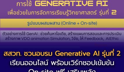 Blogครู-อาจารย์นักเรียน ครูห้ามพลาด! สสวท. ชวนอบรม Generative AI รุ่นที่ 2 เรียนออนไลน์ พร้อมเวิร์กชอปเข้มข้น On-site ฟรี เสริมพลังจัดการเรียนรู้วิทยาศาสตร์ยุคใหม่ EZ Webmaster March 13, 2026 สถาบันส่งเสริมการสอนวิทยาศาสตร์และเทคโนโลยี (สสวท.) เชิญชวนครูผู้สอนเข้าร่วมอบรมหลักสูตร “การใช้ Generative AI เพื่อช่วยในการจัดการเรียนรู้วิทยาศาสตร์” รุ่นที่ 2 ในรูปแบบผสมผสาน (Blended Learning: Online + On-site) จัดกิจกรรมระหว่างวันที่ 1 มีนาคม – 31 พฤษภาคม 2569 เพื่อเสริมทักษะการใช้ Generative AI ในการคิดไอเดีย สร้างสื่อการเรียนรู้ แผนการสอน การประเมินผล รวมถึงการสร้างภาพ วิดีโอ…
