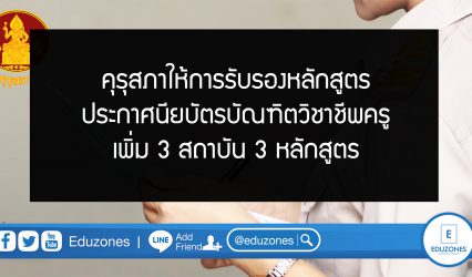 Blogนักศึกษา คุรุสภาให้การรับรองหลักสูตรประกาศนียบัตรบัณฑิตวิชาชีพครู เพิ่ม 3 สถาบัน 3 หลักสูตร EZ Webmaster February 9, 2020 ข่าวดีสำหรับผู้ที่สนใจศึกษาต่อประกาศนียบัตรวิชาชีพครู…คณะกรรมการคุรุสภา มีมติให้การรับรองหลักสูตรประกาศนียบัตรบัณฑิตวิชาชีพครูเพิ่ม จำนวน 3 แห่ง ดร.วัฒนาพร ระงับทุกข์ รองเลขาธิการคณะกรรมการการศึกษาขั้นพื้นฐาน ปฏิบัติหน้าที่ ในตำแหน่งเลขาธิการคุรุสภา กล่าวว่า คณะกรรมการคุรุสภา ในการประชุม ครั้งที่ 1/2563…