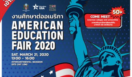 Blogกิจกรรมนักศึกษานักเรียน EducationUSA Thailand: American Education Fair 2020 EZ Webmaster February 11, 2020 สถานเอกอัครราชทูตสหรัฐอเมริกาประจำประเทศไทย ร่วมกับสถานสอนภาษาสมาคมนักเรียนเก่าสหรัฐอเมริกา (เอยูเอ) จะจัดงานศึกษาต่ออเมริกา “EducationUSA Thailand: American Education Fair 2020” ในวันเสาร์ที่ 21 มีนาคม 2563 ณ โรงแรม…