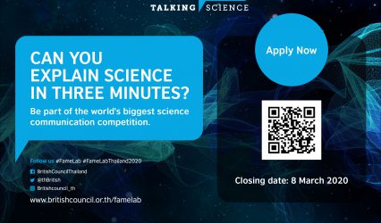 กิจกรรม บริติช เคานซิล เปิดรับสมัคร “เฟมแล็บ ไทยแลนด์ 2020” เฟ้นหาสุดยอดนักสื่อสารวิทยาศาสตร์ ตัวแทนประเทศไทยชิงแชมป์โลก EZ Webmaster February 3, 2020 บริติช เคานซิล ประเทศไทย ร่วมกับ กระทรวงการอุดมศึกษา วิทยาศาสตร์ วิจัย และนวัตกรรม, อพวช., สวทช., และ สอวช. เชิญชวนนักวิทยาศาสตร์ นักวิจัย และผู้สนใจ เข้าร่วมประกวดในโครงการ “เฟมแล็บ ไทยแลนด์ 2020” (FameLab…
