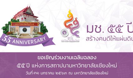 กิจกรรม งานเฉลิมฉลอง 55 ปี แห่งการสถาปนามหาวิทยาลัยเชียงใหม่ “มช. 55 ปี สร้างคนดีให้แผ่นดิน” EZ Webmaster December 24, 2019 ศาสตราจารย์คลินิก นายแพทย์ นิเวศน์ นันทจิต อธิการบดีมหาวิทยาลัยเชียงใหม่ เปิดเผยว่า มหาวิทยาลัยเชียงใหม่เป็นมหาวิทยาลัยแห่งแรกในภูมิภาค จัดตั้งขึ้นตามนโยบายของรัฐ และเจตนารมณ์ของประชาชนในภาคเหนือเพื่อให้เป็นศูนย์กลางทางวิชาการและวิชาชีพชั้นสูง ได้เปิดทำการเรียนการสอนครั้งแรก เมื่อวันที่ 18 มิถุนายน 2507 และได้รับพระมหากรุณาธิคุณจากพระบาทสมเด็จพระบรมชนกาธิเบศร มหาภูมิพล…