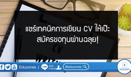 ทุนดีดีนักศึกษานักเรียน แชร์เทคนิคการเขียน CV ให้เป๊ะ สมัครขอทุนผ่านฉลุย! EZ Webmaster December 1, 2019 CV คืออะไร? ก่อนจะรู้เทคนิคการเขียน CV เรามาทำความรู้จักกับ CV กันก่อน CV หรือ Curriculum Vitae นั้นส่วนใหญ่มักจะใช้ในการสมัครงานหรือสมัครเรียนต่อ โดยจะเป็นการเขียนเรื่องราว ประวัติส่วนตัว…