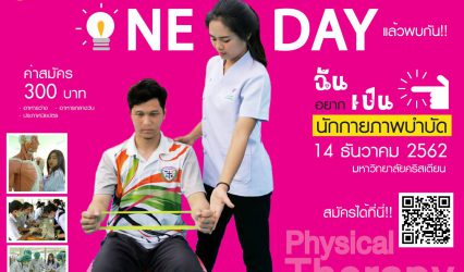 กิจกรรมนักศึกษา “โครงการหนึ่งวันฉันอยากเป็นนักกายภาพบำบัด”มหาวิทยาลัยคริสเตียน EZ Webmaster November 8, 2019 ONE DAY ฉันอยากเป็นนักกายภาพบำบัด สำหรับผู้ที่สนใจร่วมกิจกรรม ค่าสมัครเพียง 300 บาท เท่านั้น สมัครได้ที่ >> https://docs.google.com/forms/d/e/1FAIpQLSfc7_8t4VrG1yVBPCnYVS5-gFs09S3hSY4Fm8ccapmG7EhYnQ/viewform กำหนดการ โครงการหนึ่งวันฉันอยากเป็นนักกายภาพบำบัด ณ มหาวิทยาลัยคริสเตียน จังหวัดนครปฐม วันเสาร์ที่…