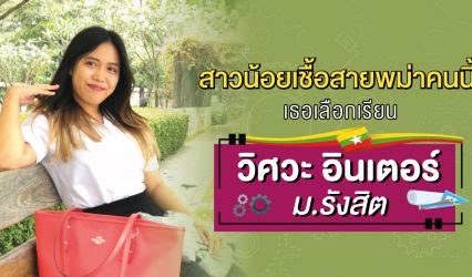 นักศึกษา สาวน้อยเชื้อสายพม่าคนนี้ เธอเลือกเรียน “วิศวะ อินเตอร์ ม.รังสิต” EZ Webmaster September 6, 2019 นางสาว Kyawt Thinzar Soe หรือ KKay นักศึกษาชั้นปีที่ 3 สาขาวิชาวิศวกรรมโยธา วิทยาลัยนานาชาติ มหาวิทยาลัยรังสิต สาวน้อยเชื้อสายพม่าคนนี้เธอจบการศึกษาระดับชั้นมัธยมศึกษาตอนปลายจากโรงเรียน Great Light ประเทศพม่า หลังจากนั้นจึงตัดสินใจศึกษารายละเอียดเกี่ยวกับมหาวิทยาลัยต่างประเทศเพื่อต้องการศึกษาต่อ…