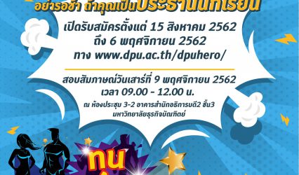 นักเรียน ม.ธุรกิจบัณฑิตย์ ชวน “ประธานนักเรียน” รับทุน HERO ทุนการศึกษาตลอดหลักสูตร EZ Webmaster August 29, 2019 โอกาสของคุณมาถึงแล้ว มหาวิทยาลัยธุรกิจบัณฑิตย์ มอบทุนการศึกษาให้ “ประธานนักเรียน” รับทุน HERO โดยสามารถเลือกเข้าศึกษาต่อได้ในวิทยาลัย / คณะ ที่ต้องการ อย่ารอช้า..เตรียม Portfolio พร้อมพกความมั่นใจมากับตำแหน่งประธานนักเรียนของโรงเรียน สมัครด่วน!! ตั้งแต่บัดนี้ ถึง 6 พฤศจิกายน 2562 พร้อมสอบสัมภาษณ์ในวันเสาร์ที่ 9…