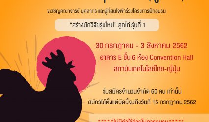 กิจกรรม โครงการฝึกอบรม “สร้างนักวิจัยรุ่นใหม่” (ลูกไก่) รุ่นที่ 1 EZ Webmaster June 28, 2019 สำนักงานคณะกรรมการวิจัยแห่งชาติ (วช.) ร่วมกับ สถาบันเทคโนโลยีไทย-ญี่ปุ่น (TNI) ได้กำหนดโครงการฝึกอบรม “สร้างนักวิจัยรุ่นใหม่” (ลูกไก่) รุ่นที่ 1 ระหว่างวันที่ 30 กรกฎาคม – 3 สิงหาคม 2562 ณ อาคาร E ชั้น 6 ห้อง Convention…