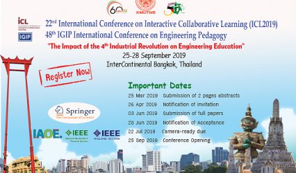 Blogครู-อาจารย์นักศึกษา คณะครุศาสตร์ฯ มจพ. จัดประชุมวิชาการระดับนานาชาติ ICL 2019 เรื่อง “The Impact of the 4th Industrial Revolution on Engineering Education” EZ Webmaster March 29, 2019 มหาวิทยาลัยเทคโนโลยีพระจอมเกล้าพระนครเหนือ (มจพ.) โดยคณะครุศาสตร์อุตสาหกรรม กำหนดจัดประชุมวิชาการระดับนานาชาติ ICL2019 หัวข้อเรื่อง “ The Impact of the 4th Industrial Revolution on Engineering…