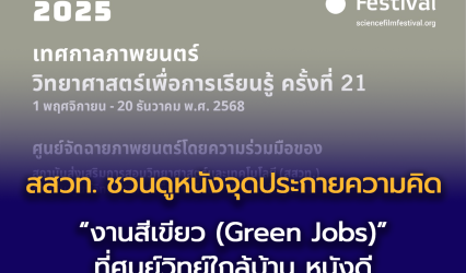 ชวนดูฟรี! เทศกาลภาพยนตร์วิทยาศาสตร์ 2025 เปิดโลก ‘งานสีเขียว’ ถึง 20 ธันวาคมนี้ ที่ศูนย์วิทยาศาสตร์ฯ ทั่วประเทศ EZ WebmasterDecember 8, 2025 ชวนดูฟรี! เทศกาลภาพยนตร์วิทยาศาสตร์ 2025 เปิดโลก ‘งานสีเขียว’ ถึง 20 ธันวาคมนี้ที่ศูนย์วิทยาศาสตร์ฯ ทั่วประเทศ สถาบันส่งเสริมการสอนวิทยาศาสตร์และเทคโนโลยี (สสวท.) ร่วมกับศูนย์วิทยาศาสตร์เพื่อการศึกษาทั่วทุกภูมิภาค ขอเชิญชวนครู นักเรียน เยาวชน และผู้สนใจ เปิดประสบการณ์เรียนรู้แนวคิด “งานสีเขียว…