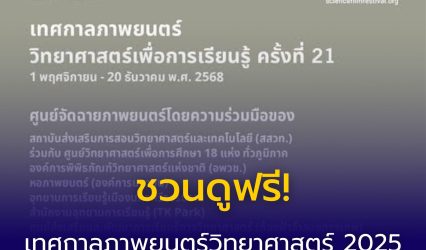 กิจกรรม ชวนดูฟรี! เทศกาลภาพยนตร์วิทยาศาสตร์ 2025 เปิดโลก ‘งานสีเขียว’ ถึง 20 ธันวาคมนี้ ที่ศูนย์วิทยาศาสตร์ฯ ทั่วประเทศ EZ Webmaster December 8, 2025 ชวนดูฟรี! เทศกาลภาพยนตร์วิทยาศาสตร์ 2025 เปิดโลก ‘งานสีเขียว’ ถึง 20 ธันวาคมนี้ที่ศูนย์วิทยาศาสตร์ฯ ทั่วประเทศ สถาบันส่งเสริมการสอนวิทยาศาสตร์และเทคโนโลยี (สสวท.) ร่วมกับศูนย์วิทยาศาสตร์เพื่อการศึกษาทั่วทุกภูมิภาค ขอเชิญชวนครู นักเรียน เยาวชน และผู้สนใจ…