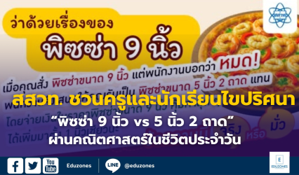 นักเรียนครู-อาจารย์นักศึกษา สสวท. ชวนครูและนักเรียนไขปริศนา “พิซซ่า 9 นิ้ว vs 5 นิ้ว 2 ถาด” ผ่านคณิตศาสตร์ในชีวิตประจำวัน EZ Webmaster October 9, 2025 สสวท. ชวนครูและนักเรียนไขปริศนา “พิซซ่า 9 นิ้ว vs 5 นิ้ว 2 ถาด” ผ่านคณิตศาสตร์ในชีวิตประจำวัน เคยไหม? เมื่อสั่งพิซซ่าขนาด 9 นิ้ว…