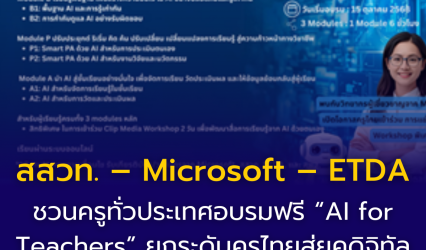 กิจกรรมBlogครู-อาจารย์ สสวท. – Microsoft – ETDA ชวนครูทั่วประเทศอบรมฟรี “AI for Teachers” ยกระดับครูไทยสู่ยุคดิจิทัล สมัครได้ถึง 14 ตุลาคม 2568 นี้ EZ Webmaster October 10, 2025 สสวท. – Microsoft – ETDA ชวนครูทั่วประเทศอบรมฟรี “AI for Teachers” ยกระดับครูไทยสู่ยุคดิจิทัล สมัครได้ถึง 14 ตุลาคม 2568 นี้ สถาบันส่งเสริมการสอนวิทยาศาสตร์และเทคโนโลยี (สสวท.)…