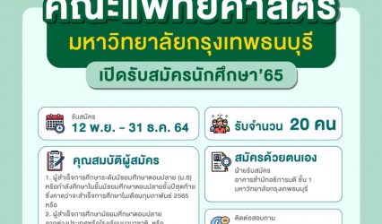Blogนักเรียน อยากเป็นหมอ ไม่ต้องรอที่ไหน! คณะแพทยศาสตร์ มหาวิทยาลัยกรุงเทพธนบุรี เปิดรับวันนี้ 20 ที่นั่ง tui sakrapee November 25, 2021 ข่าวดี!! ถึงน้องๆ #DEK65 ที่มีความฝันอยากเป็นหมอ คณะแพทยศาสตร์ มหาวิทยาลัยกรุงเทพธนบุรี ได้ผ่านการรับรองหลักสูตรแพทยศาสตรบัณฑิต จากแพทยสภาอย่างเป็นทางการแล้ว เปิดรับสมัครนักศึกษาแล้ว!! ตั้งแต่วันนี้ – 31 ธ.ค. 2564 รับจำนวน 20…