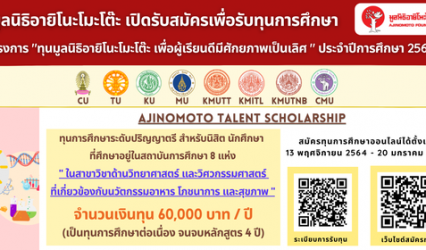 นักศึกษา ทุนมูลนิธิอายิโนะโมะโต๊ะ เพื่อผู้เรียนดีมีศักยภาพเป็นเลิศ ประจำปีการศึกษา 2564 EZ Webmaster November 16, 2021 โอกาสดีๆ มาแล้วจ้า มูลนิธิฯ เปิดรับสมัครทุนในโครงการ “ทุนมูลนิธิอายิโนะโมะโต๊ะ เพื่อผู้เรียนดีมีศักยภาพเป็นเลิศ ประจำปีการศึกษา 2564” จำนวนเงินทุน 60,000 บาท / ปี สำหรับนิสิต นักศึกษา ในระดับปริญญาตรี…