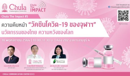 กิจกรรม จุฬาฯ จัดเสวนา CHULA the Impact ครั้งที่ 5 “ความคืบหน้าวัคซีนโควิด-19 ของจุฬาฯ นวัตกรรมของไทย ความหวังของโลก” EZ Webmaster November 16, 2021 จุฬาฯ จัดเสวนา CHULA the Impact ครั้งที่ 5 “ความคืบหน้าวัคซีนโควิด-19 ของจุฬาฯ นวัตกรรมของไทย ความหวังของโลก” ในวันพฤหัสบดีที่ 18 พฤศจิกายน 2564 เวลา…