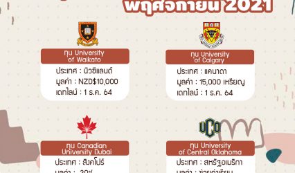นักศึกษานักเรียน 4 ทุนเรียนต่อระดับปริญญาตรี อัปเดตเดือนพฤศจิกายน ปี 2021 EZ Webmaster November 14, 2021 สำหรับน้องๆ ที่กำลังศึกษาอยู่ระดับชั้นมัธยมศึกษาปีที่ 6 หรือผู้ที่กำลังสนใจอยากไปศึกษาต่อต่างประเทศในระดับปริญญาตรี วันนี้เราได้รวมทุนไปเรียนต่อต่างประเทศในระดับปริญญาตรี อัปเดตเดือนกันยายน ปี 2021 มาฝากกันค่ะ 1.ทุน University of Waikato University of…