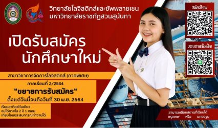 Blogนักเรียน เรียนวันอาทิตย์วันเดียว! สาขาการจัดการโลจิสติกส์ (ภาคพิเศษ) สวนสุนันทา ขยายเวลารับสมัครถึง 30พ.ย.นี้ tui sakrapee November 9, 2021 วิทยาลัยโลจิสติกส์และซัพพลายเชน มหาวิทยาลัยราชภัฏสวนสุนันทา ขยายเวลารับสมัคร!!! ภาคเรียนที่ 2 ปีการศึกษา 2564 หลักสูตรสาขาการจัดการโลจิสติกส์ (ภาคพิเศษ) …..เรียนวันอาทิตย์วันเดียว เลือกเรียนได้ทั้ง กรุงเทพฯ หรือ นครปฐม…. เรียนจริง…