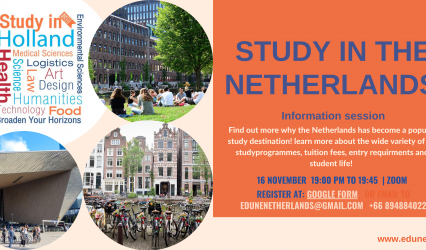 นักเรียนนักศึกษา งานบรรยายศึกษาต่อต่างประเทศเนเธอร์แลนด์ EZ Webmaster November 8, 2021 ขอเชิญน้องๆเข้าร่วมฟังงานบรรยายศึกษาต่อต่างประเทศเนเธอร์แลนด์(ฮอลแลนด์) ในวันพฤหัสบดีที่ 16พฤศจิกายน 2021 เวลา 19.00น.เป็นต้นไป สำหรับนักเรียนที่สนใจจะไปศึกษาต่อในระดับปริญญาตรี/โท ต่างประเทศ ของประเทศเนเธอร์แลนด์ เรียนรู้เพิ่มเติมเกี่ยวกับ ระบบการศึกษาและวิธีการสมัครเข้าเรียนมหาวิทยาลัยในเนเธอร์แลนด์ หลักสูตรต่างๆ ค่าเล่าเรียนและทุนการศึกษา ลงทะเบียนผ่านทางลิงค์ https://forms.gle/eqex2xqYxvmh7xih7 หรือ edunetherlands@gmail.com…
