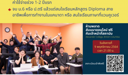 นักเรียน สัมมนาออนไลน์ฟรี สถาบัน Alexander College, British Columbia EZ Webmaster November 5, 2021 ห้ามพลาด สัมมนาออนไลน์ฟรี พบกับเจ้าหน้าที่สถาบัน Alexander College, British Columbia วันอังคารที่ 9 พฤศจิกายน เวลา 21.00 น. ลงทะเบียนได้ที่ https://forms.gle/rrYVPzVNcWBwZ57E8 Alexander…