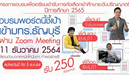 นักเรียน โครงการอบรมพอร์ตนี้ชี้เป้า เข้า มทร.ธัญบุรี ปีการศึกษา 2565 EZ Webmaster November 5, 2021 โครงการอบรมเพื่อเตรียมเข้ารับการคัดเลือกเข้าศึกษาระดับปริญญาตรี ปีการศึกษา 2565 “อบรมพอร์ตนี้ชี้เป้า เข้ามทร.ธัญบุรี ผ่าน Zoom Meeting เวลา 9.00 – 16.30 น. วันที่ 11 ธันวาคม…