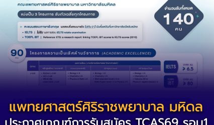 นักเรียนBlog คณะแพทยศาสตร์ศิริราชพยาบาล มหิดล ประกาศเกณฑ์การรับสมัคร TCAS69 รอบที่ 1 Portfolio EZ Webmaster August 8, 2025 ประกาศเกณฑ์ผลการเรียนและคะแนนภาษาอังกฤษ TCAS 69 รอบ 1 (Portfolio) ปีการศึกษา 2569 คณะแพทยศาสตร์ศิริราชพยาบาล มหาวิทยาลัยมหิดล 🩺 🌟 เปิดโอกาสให้นักเรียนและผู้จบการศึกษาที่มีความสามารถโดดเด่นทั้งด้านวิชาการและภาษาได้เข้ามาเป็นส่วนหนึ่งของศิริราช 📌 โดยเปิดรับสมัคร 3 โครงการ…