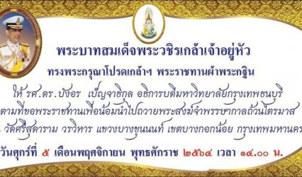 Blogกิจกรรม กําหนดการ พิธีถวายผ้ากฐินพระราชทาน ม.กรุงเทพธนบุรี ณ วัดศรีสุดาราม วรวิหาร tui sakrapee November 4, 2021 กําหนดการ พิธีถวายผ้ากฐินพระราชทานประจําปี พุทธศักราช ๒๕๖๔ มหาวิทยาลัยกรุงเทพธนบุรี ณ วัดศรีสุดาราม วรวิหาร แขวงบางขุนนนท์ เขตบางกอกน้อย กรุงเทพมหานคร วันศุกร์ที่ ๕ พฤศจิกายน ๒๕๖๔ ——————-…