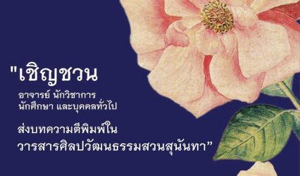 Blogกิจกรรม สำนักศิลป์ เปิดรับผลงานตีพิมพ์ใน “วารสารศิลปวัฒนธรรมสวนสุนันทา” Vol.๐๒ tui sakrapee October 25, 2021 สำนักศิลป์ เปิดรับผลงานตีพิมพ์ใน “วารสารศิลปวัฒนธรรมสวนสุนันทา” Vol.๐๒ เพื่อเป็นแหล่งเผยแพร่และนำเสนอผลงานวิจัย ผลงานวิชาการ ผลงานสร้างสรรค์ สำนักศิลปะและวัฒนธรรม ขอเชิญชวน นักวิจัย นักวิชาการ อาจารย์ และบุคคลทั่วไป ตีพิมพ์บทความใน “วารสารศิลปวัฒนธรรมสวนสุนันทา” Vol.๐๒l…