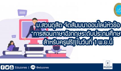 Blog ม.สวนดุสิต จัดสัมมนาออนไลน์หัวข้อ “การสอนภาษาอังกฤษระดับประถมศึกษา” สำหรับครูฟรี! ในวันที่ 1 พ.ย.นี้ EZ Webmaster October 22, 2021 คณะครุศาสตร์ มหาวิทยาลัยสวนดุสิต เชิญคุณครูที่สนใจเข้าร่วมสัมมนาออนไลน์ หัวข้อ: การสอนภาษาอังกฤษระดับประถมศึกษา (ELT in Elementary Education) ในวันที่ 1 พฤศจิกายน 2564 ฟรี ไม่มีค่าใช้จ่าย …