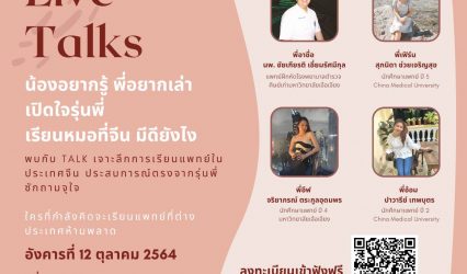 นักเรียน น้องอยากรู้ พี่อยากเล่า เปิดใจรุ่นพี่ เรียนหมอที่จีน มีดียังไง EZ Webmaster October 6, 2021 พบกับ talk เจาะลึกการเรียนแพทย์ในประเทศจีน ประสบการณ์ตรงจากรุ่นพี่ ซักถามจุใจ ใครที่กำลังคิดจะเรียนแพทย์ที่ต่างประเทศห้ามพลาด พบกับ – พี่อาชื่อ นพ. ชัยเกียรติ เอี่ยมรัศมีกุล แพทย์ฝึกหัดโรงพยาบาลตำรวจ ศิษย์เก่ามหาวิทยาลัยเจ้อเจียง – พี่เฟิร์น…