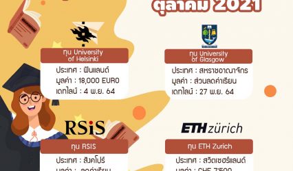 ทุนดีดี 4 ทุนเรียนต่อปริญญาโท อัปเดตเดือนตุลาคม 2021 EZ Webmaster October 5, 2021 สำหรับน้องที่กำลังศึกษาในระดับปริญญาตรี หรือผู้ที่ทำงานแล้วสนใจอยากศึกษาต่อในระดับปริญญาโทที่ต่างประเทศ วันนี้เราได้ 4 ทุนเรียนต่อระดับปริญญาโท อัปเดตเดือนตุลาคม ปี 2021 มาฝากกันค่ะ 1.ทุน University of Helsinki ทุน Full…
