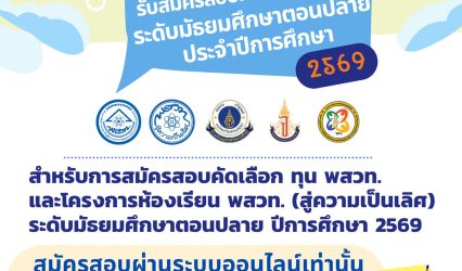 ทุนดีดีนักเรียน สสวท. รับสมัคร ทุน พสวท. ระดับมัธยมศึกษาตอนปลาย จำนวน 40 ทุน EZ Webmaster August 4, 2025 สสวท. รับสมัครนักเรียนที่กำลังศึกษาอยู่ในชั้นมัธยมศึกษาปีที่ 3 หรือเทียบเท่า ในปีการศึกษา 2568 สำหรับการสมัครสอบคัดเลือก 1. ทุน พสวท. ระดับมัธยมศึกษาตอนปลาย จำนวน 40 ทุน 2. โครงการห้องเรียน…