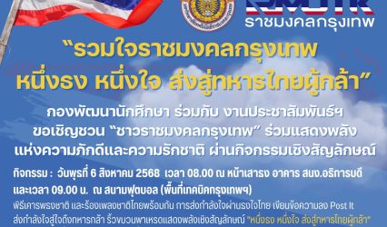 Blogนักศึกษา ราชมงคลกรุงเทพรวมพลัง “หนึ่งธง หนึ่งใจ” ส่งกำลังใจสู่ทหารกล้า tui sakrapee August 1, 2025 มหาวิทยาลัยเทคโนโลยีราชมงคลกรุงเทพ เตรียมจัดกิจกรรมใหญ่ “รวมใจราชมงคลกรุงเทพ หนึ่งธง หนึ่งใจ ส่งสู่ทหารไทยผู้กล้า” เพื่อแสดงพลังแห่งความภักดีต่อชาติ และส่งต่อกำลังใจถึงทหารและบุคลากรที่ปฏิบัติหน้าที่บริเวณแนวชายแดนไทย–กัมพูชา โดยจัดขึ้นในวันพุธที่ 6 สิงหาคม 2568 ณ บริเวณหน้าเสาธง อาคารสำนักงานอธิการบดี และสนามฟุตบอล…