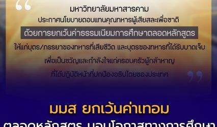 ข่าวเด่นนักเรียน มมส ยกเว้นค่าเทอมตลอดหลักสูตร มอบโอกาสทางการศึกษาให้ครอบครัวทหารผู้เสียสละเพื่อชาติ EZ Webmaster August 2, 2025 มหาวิทยาลัยมหาสารคาม ตระหนักถึงความสำคัญของการเสียสละเพื่อรักษาอธิปไตยของชาติ และเพื่อเป็นการแสดงความขอบคุณและตอบแทนในความกล้าหาญของทหารหาญ ผู้ปฏิบัติหน้าที่ในการปกป้องผืนแผ่นดินไทย มหาวิทยาลัยจึงขอสนับสนุนด้านการศึกษาแก่ ครอบครัวผู้เสียสละ ประกอบด้วย บุตรและภรรยาของทหารผู้เสียชีวิต และบุตรของทหารผู้ที่ได้รับบาดเจ็บ จากเหตุการณ์ความไม่สงบในพื้นที่ชายแดนไทย-กัมพูชา วันนี้ (1 สิงหาคม 2568) รองศาสตราจารย์ ดร.ประยุกต์…
