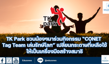 นักเรียน TK Park ชวนน้องๆมาร่วมกิจกรรม “CONET Tag Team เล่นรักษ์โลก” เปลี่ยนกระดาษที่เหลือใช้ให้เป็นเครื่องมือสร้างสมาธิ EZ Webmaster July 29, 2025 อุทยานการเรียนรู้ TK Park และบริษัท บางกอกแพค จำกัด (Bangkokpack) ชวนน้อง ๆ อายุ 7–12 ปี มาพัฒนาทักษะผ่านการเล่นด้วยของเล่นจากกระดาษรูปเรขาคณิต กับกิจกรรมเวิร์กช็อป CONET Tag…