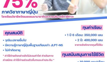Blogทุนดีดี จัดให้สายญี่ปุ่น ! ทุนเรียนภาษาญี่ปุ่น75% ทุนเว้นค่าเรียน50% พร้อมโครงการเรียนภาษาญี่ปุ่นระยะสั้น 1 เดือน tui sakrapee July 29, 2025 ทุนเรียนภาษาญี่ปุ่น75% ทุนเรียนภาษาญี่ปุ่น75% ระยะเวลา1 ปี 6 เดือน-2ปี รอบเมษายน 2569 โรงเรียนวิชาชีพวัฒนธรรมนานาชาติและการบริบาลฮิกาชิคาวะ ภาควิชาภาษาญี่ปุ่น ให้ทุนละเว้นค่าเรียน75% รวมแล้วกว่า 950,000 เยน แบ่งชำระค่าเทอมได้ ไม่จำเป็นต้องเป็นนักเรียนนักศึกษา…