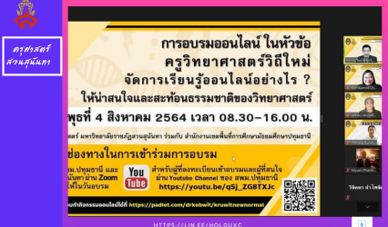 Blogครู-อาจารย์ สวนสุนันทาจับมือสพม.ปทุมธานีจัดอบรมเพิ่มสมรรถนะการเรียนรู้ออนไลน์ครูวิทยาศาสตร์วิถีใหม่ tui sakrapee August 4, 2021 วันที่ 4 สิงหาคม พ.ศ.2564 เวลา 08.30-16.00 น. คณะครุศาสตร์ มหาวิทยาลัยราชภัฏสวนสุนันทา ร่วมกับสำนักงานเขตพื้นที่การศึกษามัธยมศึกษาปทุมธานี (สพม.) จ.ปทุมธานี จัดอบรมหัวข้อ “ครูวิทยาศาสตร์วิถีใหม่ จัดการเรียนรู้ออนไลน์อย่างไร ให้น่าสนใจและสะท้อนธรรมชาติของวิทยาศาสตร์”…
