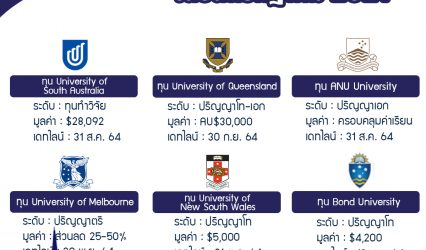 ทุนดีดี 6 ทุนเรียนต่อประเทศออสเตรเลีย อัพเดทเดือนกรกฎาคม 2021 EZ Webmaster July 27, 2021 ประเทศออสเตรเลีย เป็นหนึ่งในประเทศที่มีนักเรียนักศึกษาเดินทางไปเรียนต่อค่อนข้างสูง เพราะเป็นประเทศที่เหมาะกับการฝึกภาษา มีหลักสูตรการเรียนที่หลากหลาย ค่าครองชีพที่ไม่สูงจนเกินไป และยังมีทุนสำหรับการไปเรียนต่อที่หลากหลายอีกด้วย วันนี้เราจึงรวบรวมทุนเรียนต่อประเทศออสเตรเลีย อัพเดทเดือนกรกฎาคม ปี 2021 มาฝากกันค่ะ 1.ทุน University of South…