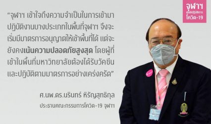 ครู-อาจารย์ จุฬาฯ ตอกย้ำความปลอดภัยในแคมปัส ปรับใช้เกณฑ์การฉีดวัดซีนเพื่อคัดกรองคนเข้าพื้นที่ EZ Webmaster July 5, 2021 คณะกรรมการศูนย์โควิด-19 จุฬาฯ ได้กำหนดมาตรการเพื่อให้เกิดความปลอดภัยแก่นิสิตและบุคลากรที่มีความจำเป็นต้องเข้ามาในพื้นที่มหาวิทยาลัยในระหว่างการปิดสถานที่ทำการชั่วคราวเนื่องจากสถานการณ์การแพร่ระบาดของเชื้อโควิด-19 ด้วยการใช้เกณฑ์การฉีดวัคซีนเป็นเครื่องมือในการคัดกรองผู้เข้าพื้นที่มหาวิทยาลัย ศ.นพ.ดร.นรินทร์ หิรัญสุทธิกุล ประธานคณะกรรมการโควิด-19 จุฬาฯ กล่าวว่า เนื่องจากมหาวิทยาลัยปิดสถานที่ทำการชั่วคราวมาเป็นระยะเวลาหนึ่งแล้ว แต่ต้องเข้าใจว่ามีงานบางประเภท เช่น งานด้านวิจัยในห้องแล็ปที่จำเป็นต้องมีบุคลากรหรือนิสิต เข้ามาดำเนินการ มิฉะนั้นจะเกิดความเสียหาย โชคดีที่ก่อนหน้านี้จุฬาลงกรณ์มหาวิทยาลัยได้จัดตั้งศูนย์บริการวัคซีนจุฬาฯ เพื่อช่วยเหลือภาครัฐในการกระจายวัคซีนให้แก่ประชาชน โดยเน้นให้บริการฉีดวัคซีนแก่สถาบันการศึกษาที่อยู่ในเขตปทุมวัน…