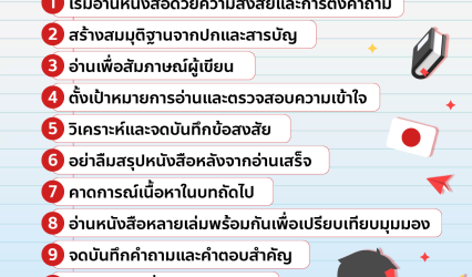 Blogนักศึกษา 10 เทคนิคการอ่านแบบอัจฉริยะ มหาวิทยาลัยโตเกียว จากหนังสือ อ่านแบบโทได EZ Webmaster July 22, 2025 10 ข้อคิดที่ได้จากหนังสืออ่านแบบโทได 1. เริ่มอ่านหนังสือด้วยความสงสัยและการตั้งคำถาม การอ่านหนังสือไม่ใช่แค่การรับข้อมูลเข้ามา แต่คือการท้าทายความคิดของผู้เขียนผ่านคำถาม เช่น ทำไมผู้เขียนถึงเลือกเขียนแบบนี้? สิ่งนี้มีความจริงหรือไม่? คำถามเหล่านี้จะช่วยให้เราตรวจสอบข้อมูลและฝึกความคิดให้เฉียบคมขึ้น การตั้งคำถามยังทำให้เราได้เห็นหลายมิติของเนื้อหาที่บางครั้งอาจไม่ชัดเจนในครั้งแรกที่อ่าน 2. สร้างสมมุติฐานจากปกและสารบัญ ก่อนที่เราจะเริ่มอ่านหนังสือ ควรอ่านชื่อหนังสือ ข้อมูลบนปก…