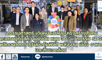 กิจกรรม ม.ธรรมศาสตร์ เดินหน้าเปลี่ยนโครงสร้างสังคมและเศรษฐกิจสู่ความยั่งยืน หนุน 30 “นวัตกรรม SDGs” พลิกอนาคตการรับมือภัยพิบัติ พลังงาน เมือง อาหาร และสิ่งแวดล้อม พร้อมปิด Pain Point หลากความเปราะบางของประเทศ EZ Webmaster July 22, 2025 มหาวิทยาลัยธรรมศาสตร์ (มธ.) ตอกย้ำบทบาท “มหาวิทยาลัยเพื่อประชาชน” เดินหน้าขับเคลื่อนเป้าหมายการพัฒนาที่ยั่งยืน (Sustainable Development Goals – SDGs) สู่การเปลี่ยนแปลงที่จับต้องผ่านการผสานนโยบายเชิงระบบกับการวิจัยและพัฒนาเพื่อสังคมอย่างแท้จริง พร้อมเปิดตัวนิทรรศการ “SDGs เพื่อประชาชน: นวัตกรรมเพื่อชีวิต – สร้างอนาคตที่ยั่งยืน” ที่จัดแสดงผลงานนวัตกรรมกว่า 30 ผลงาน จากคณาจารย์และนักวิจัยในหลากหลายสาขาวิชา ซึ่งสะท้อนความมุ่งมั่นของมธ. ในการแก้ไขปัญหาเชิงโครงสร้างของสังคมไทย เน้นครอบคลุมทั้งด้านภัยพิบัติ…
