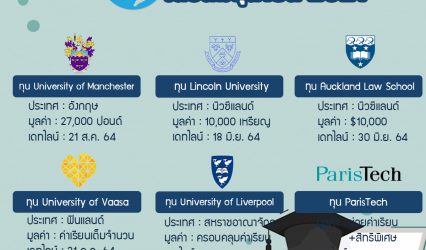 Blog 6 ทุนเรียนต่อระดับปริญญาโท เดือนมิถุนายน ปี 2021 EZ Webmaster June 5, 2021 สำหรับน้องๆ ที่กำลังศึกษาในระดับปริญญาตรี หรือผู้ที่สนใจอยากศึกษาต่อในระดับปริญญาโทที่ต่างประเทศนั้น วันนี้เราได้รวมทุนเรียนต่อในระดับปริญญาโท อัพเดทเดือนมิถุนายน ปี 2021 ทั้ง 6 ทุน มาฝากกันค่ะ 1.ทุน Auckland Law School…