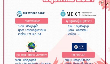 Blog 4 ทุนเรียนต่อประเทศญี่ปุ่น อัพเดตเดือนพฤษภาคม 2021 EZ Webmaster May 18, 2021 ถ้าพูดถึงประเทศที่หลายคนสนใจไปเรียนต่อในแถบเอเชียแล้ว ประเทศยอดฮิตที่เราต้องนึกถึงเป็นอันดับแรกๆ เลยก็คือ “ประเทศญี่ปุ่น” เพราะเป็นประเทศที่มีระบบการศึกษาที่มีคุณภาพ มีภาษา วัฒนธรรมที่น่าหลงใหล รวมถึงเศรษฐกิจและเทคโนโลยีที่ก้าวหน้าอันดับต้นๆ ของโลก วันนี้เราจึงมี 4 ทุนเรียนประเทศญี่ปุ่น ที่เปิดรับสมัครในช่วงนี้มาฝากกันค่ะ 1.ทุนJJ/WBGSP ทุน…