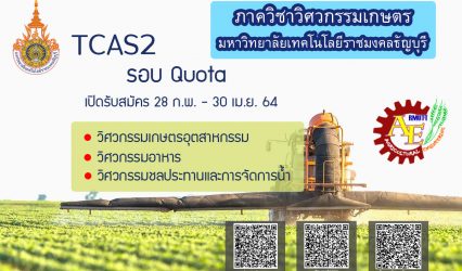 Blogนักเรียน สาขาแห่งอนาคต! วิศวกรรมเกษตร มทร.ธัญบุรี เปิดรับนักศึกษาใหม่ สู่การเป็นนักปฏิบัติมืออาชีพ tui sakrapee April 26, 2021 ภาควิชาวิศวกรรมเกษตร คณะวิศวกรรมศาสตร์ มหาวิทยาลัยเทคโนโลยีราชมงคลธัญบุรี รับสมัครนักศึกษา 3 หลักสูตร #1หลักสูตรวิศวกรรมเกษตรอุตสาหกรรม (กว. เครื่องกล) รับ 10 ที่นั่ง เป็นหลักสูตรใหม่ที่ปรับปรุงมาจากหลักสูตรวิศวกรรมเครื่องจักรกลเกษตรที่เปิดสอนมากว่า 30 ปี มุ่งเน้นการเรียนการสอนทางด้านการออกแบบ ทดสอบและพัฒนาเครื่องจักรกลโรงงาน…